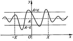 几何意义 任意给定一正数ε,作平行于x轴的两条直线y=A+ε和y=A-ε,则总存在着一个正数X,使得当x<-X或x>X时,函数y=f(x)的图形位于这两直线之间(见图2.8).