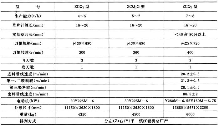 图6-2-5 底刀和刀辊 飞刀:飞刀由中碳钢或低合金钢制成,刀刃角度30~35°,刀口硬度HRC56~60°。 底刀:底刀由中碳钢制成,要求耐磨、耐冲击。刀刃角度85°左右,底刀和飞刀间隙以0.3~0.5mm为宜。 刀辊:刀辊为铸钢或高温铸铁制成,辊上装有三把与辊轴线成4~7°角的飞刀,在刀辊面有飞刀背的位置上装有螺杆以阻止切剪草料时飞刀刀片后退,同时可调节飞刀与底刀的距离。 3.主要技术特征(见表6-2-1) 表6-2-1 刀辊式切草机主要技术特征