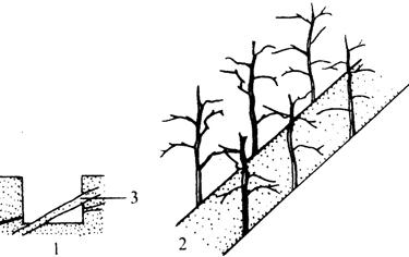 图7-37 枣树断根育苗法 1.枣沟横断面 2.枣沟 3.枣根 2.归圃育苗法 又称二级育苗,是将枣树周围散生的或刨园发生的根蘖苗集中、分级栽入苗圃中培养后再行栽植的方法。于春秋两季或雨季,将枣园中零星散生的根蘖苗按壮、弱和大小分级后集中移栽到苗圃中,株行距一般20厘米×50厘米,最适宜栽植深度为超过苗木原土印1厘米,不可过深或过浅。丛生的要剪成单株,苗高不足30厘米的留10厘米平茬,起垄封严。栽后浇透水,适期追肥浇水,加强管理,以促进苗木生长。等春天苗高达1米以上时,即可出圃移栽。为提高归圃苗的成活率,也可采用塑料小拱棚覆盖育苗的方法。小拱棚育苗一般采用大小行距栽植,大行距60厘米,小行距30~40厘米,即成两行一带栽植。一个拱棚覆盖两行。上年秋季归圃的,在早春解冻后覆盖,春天归圃的,栽植完浇水后,中耕一遍马上覆盖。覆盖期间不用再浇水,5月中下旬揭膜,揭膜后及时中耕锄草。用此法育苗成活率高,生长一致,当年秋季即可出圃,比露地育苗成活率和出苗率都可大幅提高。 |