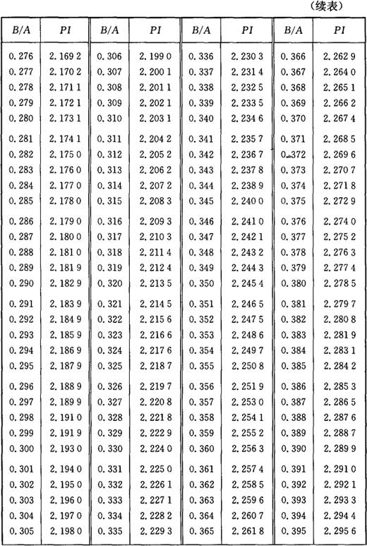图3-2 椭圆周长计算图 椭圆(图3-2)周长的计算公式为: L=API 式中 L——椭圆周长; PI——椭圆圆周率; A——椭圆长轴; B——椭圆短轴。 PI值是由B/A的比值确定的,不同比值的椭圆周率PI,见表3-2所列。 表3-2 椭圆圆周率表