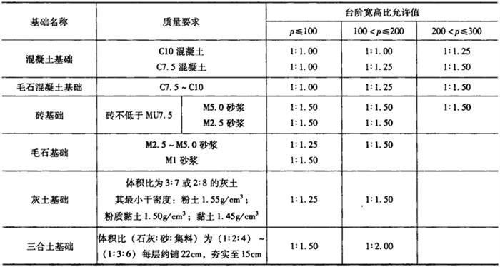 式中 b——按地基承载力算得的基底宽度(m); b0——基础顶面的砌体宽度(m); H0——基础的高度(m); tanα——基础阶梯宽高比的允许值,见表2-23。 表2-23 刚性基础阶梯宽高比的允许值