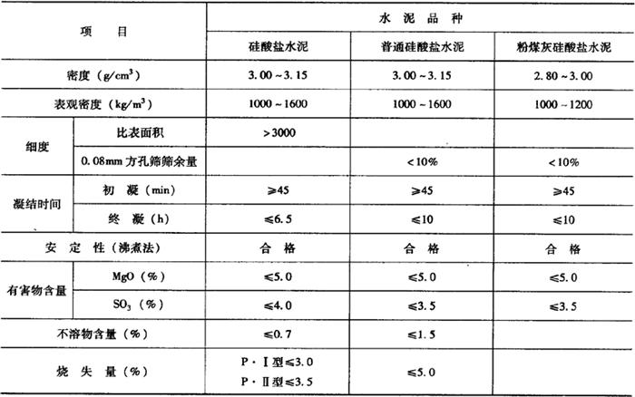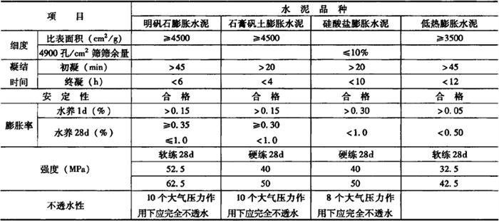 | 释义 | 刚性防水的主要组成材料 刚性防水的主要组成材料与普通混凝土大致相同,即由水泥、砂石骨料、水和适宜的外加剂组成。 (一)水泥 水泥是刚性防水工程中的关键材料,如何正确选择水泥的强度等级、品种、性能和质量,是一项关键性的工作,水泥的质量如何不仅直接关系到防水工程的质量,而且也关系到防水工程的造价高低。 1.水泥强度等级 用于防水混凝土的水泥,其强度等级不宜低于42.5MPa;用于防水砂浆的水泥,其强度等级不宜低于32.5MPa。 2.水泥品种选择 在不受侵蚀性介质和冻融作用时,宜用普通硅酸盐水泥、火山灰质硅酸盐水泥、粉煤灰硅酸盐水泥。如采用矿渣硅酸盐水泥时,则必须掺入外加剂,以降低泌水率。 防水工程在受冻融作用时,应当优先选用硅酸盐水泥或普通硅酸盐水泥,而不宜采用火山灰质硅酸盐水泥和粉煤灰硅酸盐水泥。如受侵蚀性介质作用时,应按照设计要求选用合适的水泥品种。 当选用补偿收缩混凝土作为防水层时,可选用膨胀水泥。 3.水泥质量要求 水泥是刚性防水材料中的胶凝材料,水泥质量的好坏,关系到防水混凝土和防水砂浆的质量,必须高度重视。在防水工程中,不得使用过期或受潮结块的水泥;不得将不同品种或不同强度等级的水泥混合使用。对地方性小厂生产的水泥,更应当谨慎使用,必须在试验其性能指标合格后,方可采用。 目前在实际防水工程中,最常选用的水泥是硅酸盐系列水泥和膨胀水泥两大类,其质量指标分别见表10-3和表10-4。 表10-3 硅酸盐系列水泥质量指标