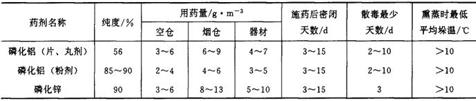 (4)磷化氢的使用范围及使用要求。 ①使用范围:磷化氢主要用于贮烟仓库熏蒸,也可熏蒸器材和空仓。 ②使用量和熏蒸要求:磷化铝、磷化锌的使用量、密闭时间及散毒时间见表11-3-4。 表11-3-4 磷化氢熏蒸用药量及熏蒸要求