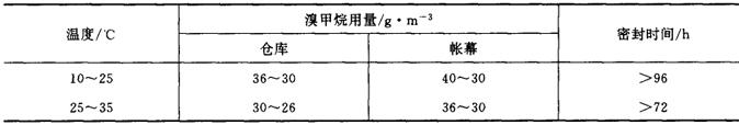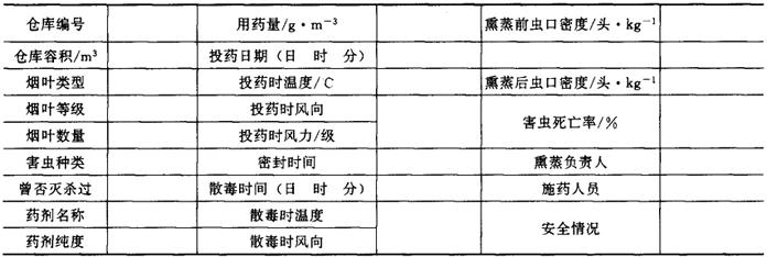 ②测溴灯以甲醇或乙醇为燃料,加入燃料时不要超过容器的2/3。测毒以前,必须将铜丝网烧透,待火焰正常后测试。 ③测毒时,火焰的大小应调节适当,火焰接触丝网才能显示出焰色。在强烈阳光下应遮挡阳光进行观测。 ④使用测溴灯应注意防火。 3.露天货垛熏蒸施药方法 (1)露天货垛帐幕密封。 ①烟垛底部应铺垫防潮物,并使烟垛架空,离地面30~40cm;烟垛上应装防风绳罩,四周挖20~30cm深的沟。 ②密封帐幕的材料有橡皮帆布、胶质玻璃纤维布、人造革布,聚乙烯塑料薄膜等。以聚乙烯塑料薄膜使用最多,规格以厚0.23~0.35mm为好,帐幕的大小应按货垛体积而定。 ③用作磷化铝熏蒸的烟垛,在塑料帐幕全部铺披接封时留出1~2道1人高的缝,作为施药入口,投药后即用事先准备好的夹子迅速加封。 用作溴甲烷熏蒸的烟垛,在铺披帐幕前需在垛的上方装设施药皮管,用分叉导管使出药口均匀地引向烟垛的两头,然后用竹签或铁丝将皮管固定在烟垛上,出药口下垫草席或麻袋。将输药管另一端引出帐幕(在帐幕接缝处留出一个木夹宽的缝,引出导管,投药后立即加夹密封),然后进行封垛。 ④两块帐幕接合处注意密封。一般在边缘相叠后,向同一方向重复平行折叠两次(每次约宽6~8cm),再用特制的木夹或铁夹夹紧。 ⑤烟垛四周下坠的帐幕边缘,埋入20~30cm的垛边沟内,并踩实。 (2)露天货垛的用药量比仓库多10%~20%,施药方法与贮烟仓库和熏蒸施药基本相同。 (3)施药完毕,将施药口的帐幕用木夹密封。 4.利用熏蒸剂防治贮烟害虫的程序 (1)熏蒸准备。 ①做好现场调查。调查内容主要有害虫的种类、密度、虫期;贮烟仓库的密封性能、内部设备及仓库周围的安全距离(仓库周围30m不得有住房、车间、交通要道及饲养场);大气温湿度及贮烟仓库的温湿度情况。禁止夜间、大风、大雨天气进行投毒与散毒。不具备熏蒸条件的仓库一律不得熏蒸。 ②测量仓房或烟垛体积。 ③根据现场调查,制定熏蒸方案。选择熏蒸剂,计算用药量,确定施药方法、密闭方法、密闭时间、防护措施,选定能熟练掌握操作方法的人员参加。 ④准备熏蒸用具和器材。 ⑤密封仓库。把仓库所有的漏气缝隙与孔洞用纸糊三层(最外层为牛皮纸),特别要注意电梯口等部位的封闭。 (2)熏蒸施药。 ①使用磷化铝熏蒸时,施药自里向外循序进行。救护人员要密切注意施药人员的动态,施药后准确清点退出现场的施药人员。 ②无论使用磷化铝还是使用溴甲烷熏蒸,待施药完毕后,及时从库外密封施药口。 ③施药后应对熏蒸的仓房或货位四周进行测漏,如有毒气外漏,需及时采取补漏措施。 (3)熏蒸后的处理。 ①通气散毒:散毒一律从仓房外部开启门窗,先开上层,后开下层;先开下风方向门窗,后开上风方向门窗。散毒开始应及时到下风向100m内检测毒气浓度。散毒的第一天下风向30m内不得有人作业。 ②处理残渣:磷化氢熏蒸通风散毒后,应及时处理残渣,残渣应在离水源较远的地方挖坑深埋。 ③熏蒸后应检查熏蒸效果。 ④散毒后应采取有效的防虫措施,防止再感染。 ⑤熏蒸结束后,应及时填写熏蒸记录表(见表11-3-7)。 表11-3-7 熏蒸杀虫记录表
