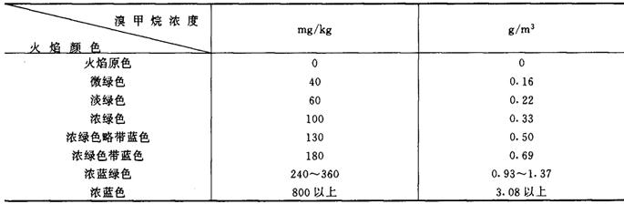 (5)贮烟仓库溴甲烷熏蒸的施药方法。溴甲烷应在仓外施药。施药步骤仍按密封,投药熏蒸,散毒等4步进行。 ①仓库预先糊封严密,作通风散毒的门窗在库外封严。并预先在库内烟垛上方装置输药耐压和喷药支管(支管数以500m2面积设3~4个为宜)。并根据仓库容积计算出投药量。 ②为控制施药量,先称出(钢瓶+药剂)的总质量,减去所需施药质量,把游锤固定在标尺上(在关闭钢瓶过程中,还会多喷出0.25kg左右,需在所需质量中扣除)。 ③在标尺开始下降时,立即旋紧钢瓶开关,稍停1~2min,使管内药液全部流出后,及时将施药孔严密封糊或夹紧。 ④溴甲烷易溶于酒精、乙醚等有机溶剂和橡胶等物质,施药时应防止药液直接喷在塑料或橡胶帐幕上。 ⑤喷药仓库通风换气后用测溴灯检查,无残毒时,方可进仓工作。 ⑥施药时如发生钢瓶喷嘴因药液凝固阻塞,可用热水淋浇喷嘴,严禁用火烘烤。 ⑦药剂必须存放在阴凉场所,严禁在烈日下曝晒。 (6)测溴灯检查溴甲烷浓度的方法。 ①表11-3-6为火焰颜色与溴甲烷毒气浓度的关系。 表II-3-6 火焰颜色与溴甲烷浓度的关系