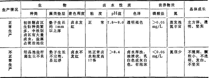 因盐田生物受外界环境影响很大,生态系统也在随时发生变化,所以加强预测预报工作,掌握盐田生态系统的演替过程,及时采取有效措施,调整生态系统,防止异常现象出现,是保证盐田正常生产极为重要的一环。一般盐田预测预报项目主要包括四个部分,即生物种类及垫子生长情况;卤水性质;营养物质;晶体生长等(表2-9-6)。