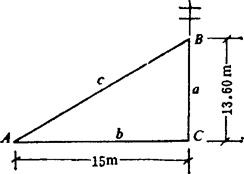 图1-5 a2+b2=c2 c2-b2=a2 c2-a2=b2 〔计算例〕 在架设电线杆,用铁线拉固如图1-6所示,高13.6米,AC长15米,求AB长度?