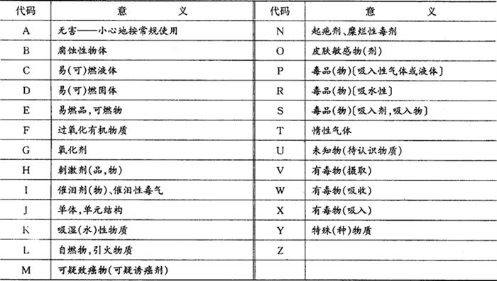 2.代码应用举例 Polysciences公司化学试剂危险品代码及防护、存储条件代码应用举例如下: 0231.N,N-DimethylanilineCHRY7g 品名:N,N-二甲基苯胺,0231#是处理和储藏编码。此种试剂是危险品,属易燃液体,有刺激性,并是特级吸水性毒品,室温储存,操作时需戴手套、化学防护眼罩和化学防毒面具或烟雾防护罩。 在Polysciences公司的产品目录中,几乎每一种试剂都有此种代表各种不同含义的代码,供参考。 国外化学试剂公司如Merck公司与Serva公司,有类似的安全标志和危险术语,以及它们的组合,而Fluka公司除了有危险和安全短语(即R,S符号)以外,还有欧洲国际危险货物运输规则的标志。 总之,在化学试剂的储存及使用中,潜伏着许多危险,但只要树立安全第一的思想,强化消防意识,随时随地严格按有关规范操作,事故是完全能够避免的,生命和财产的安全也就能有效地保障。(四)危险和安全用语及组合用语(European Community Comission) 以下所列用语,根据91/155/EC和OSHA标准。 危险用语(Risk Phrases) R1 Explosive when dry. 干燥时爆炸。 R2 Risk of explosion by shock,friction,fire or other sources of ignition. 振荡摩擦,火或其他引爆源有引起爆炸的危险。 R3 Extreme rish of explosion by shock,friction,fire or other sources of ignition. 震动摩擦,火或其他引爆源有引爆的极大危险。 R4 Forms very sensitve explosive metallic compounds. 形成非常敏感的爆炸性金属化合物。 R5 Heating may cause an explosion. 加热可能引起爆炸。 R6 Explosive with or without contact with air. 与空气接触或不接触均会爆炸。 R7 May cause fire. 可引发火焰。 R8 Contact with combustible material may cause fire. 接触易燃材料可能引起燃烧。 R9 Explosive when mixed with combustible material. 当与易燃物质混合时爆炸。 R10 Flammable. 易燃。 R11 Highly flammable. 很易燃。 R12 Extremely flammable. 极易燃。 R14 Reacts violently with water. 遇水猛烈反应。 R15 Contact with water liberates extremely flammable gases. 与水接触释放剧烈可燃气体。 R16 Explosive when mixed with oxidizing substances. 与氧化物混合时爆炸。 R17 Spontaneously flammable in air. 在空气中自燃。 R18 In use,may form flammable/explosive vapour-air mixture. 使用时形成易燃/易爆蒸气混合物。 R19 May form explosive peroxides. 可能形成爆炸性过氧化物。 R20 Harmful by inhalation. 吸入有害。 R21 Harmful in contact with skin. 接触皮肤有害。 R22 Harmful if swallowed. 吞入有害。 R23 Toxic by inhalation. 吸入有毒。 R24 Toxic in contact with skin. 接触皮肤有毒。 R25 Toxic if swallowed. 吞入有毒。 R26 Very toxic by inhalation. 吸入有剧毒。 R27 Very toxic in contact with skin. 接触皮肤有剧毒。 R28 Very toxic if swallowed. 吞入有剧毒。 R29 Contact with water liberates toxic gas. 与水接触释放出有毒气体。 R30 Can become highly flammable in use. 在使用时可能形成高度易燃物质。 R31 Contact with acids liberates toxic gas. 与酸接触释放出有毒气体。 R32 Contact with acids liberates very toxic gas. 与酸接触释放出剧毒气体。 R33 Danger of cumulative effects. 蓄积性危险。 R34 Causes bums. 引起灼伤。 R35 Causes severe burns. 引起严重灼伤。 R36 Irritating to eyes. 刺激眼睛。 R37 Irritating to respiratory system. 刺激呼吸系统。 R38 Irritating to skin. 刺激皮肤。 R39 Danger of very serious irreversible effects. 有很严重的刺激作用的危险。 R40 possible risk of irreversible effects. 可能有刺激作用。 R41 Risk of serious damage to eyes. 有严重伤害眼睛的危险。 R42 May cause sensitization by inhalation. 吸入可引起过敏。 R43 May cause sensitization bv skin contact. 接触皮肤可引起过敏。 R44 Risk of explosion if heated under confinement. 在密封下加热有爆炸的危险。 R45 May cause cancer. 可致癌。 R46 May cause heritable genetic damage. 可能引起遗传基因损害。 R48 Danger of serious damage to health by prolonged exposure. 长期暴露有严重损害健康的危险。 R49 May cause cancer by inhalation. 吸入致癌。 R50 Very toxic to aquatic organisms. 对水生生物有剧毒。 R51 Toxic to aquatic organisms. 对水生生物有毒。 R52 Harmful to aquatic organisms. 对水生生物有损害。 R53 May cause long-term adverse effects in the aquatic environment. 可能对水生物环境起长期的副作用。 R54 Toxic to flora. 对植物有毒。 R55 Toxic to fauna. 对动物的区域属性有毒害作用。 R56 Toxic to soil organisms. 对土壤中的生物有毒。 R57 Toxic to bees. 对蜜蜂有毒害。 R58 May cause long-term adverse effects in the environment. 对环境可能造成长期的不良影响。 R59 Dangerous for the ozone layer. 破坏臭氧层。 R60 May impair fertility. 可损害土壤肥力。 R61 May cause harm to the unbom child. 可对胎儿产生危害。 R62 possible risk of impaired fertility. 对土壤肥力可能存在危险。 R63 possible risk of harm to the unbom child. 对胎儿产生损害的危险可能存在。 R64 May cause harm to breastfed babies. 可对哺乳的婴儿产生损害。 R65 Harmful:may cause lung damage if swallowed. 如果吞入,可引起肺部损害。 组合危险用语(Combination Risk Phrases) R14/15 Reacts violently with water liberating extremely flammable gases. 遇水猛烈反应并释放出剧烈可燃气体。 R15/29 Contact with water liberates toxic,extremely flammable gas. 遇水可释放出有毒、剧烈可燃气体。 R20/21 Harmful by inhalation and in contact with skin. 吸入、接触皮肤都有害。 R20/22 Harmful by inhalation and if swallowed. 吸入和不慎吞下都有害。 R20/21/22 Harmful by inhalation,in contact with skin and if swallowed. 吸入、接触皮肤和吞入均有害。 R21/22 Harmful in contact with skin and