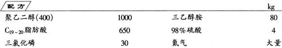 将聚乙二醇、C19~20脂肪酸和硫酸加入密封的搪瓷反应釜中,通入纯氮气,排尽空气。在40MPa压力下,温度70℃反应8h后加入三氯化磷,升温至105℃,压力为100MPa,反应7h。加入三乙醇胺,在140℃、20MPa下反应2h,冷却,即得抗静电处理剂。本品具有抗静电、柔软功能,用于合成纤维织物漂清处理。