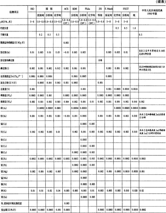| 释义 | 化学试剂与药品、化工原料的异同 化学试剂与医疗药品、化工原料有着密切的关系,又有着明显的区别。它的主要用途是用于各种实验,它的纯度要求比较高,有严格的检测标准。医疗药品则主要是用于治疗或预防各种疾病,一般对人或动物具有明显的生理或生物活性,其质量标准除要通过理化检测外,更要考虑其药理作用,毒副作用等生物方面的反应,它们的品质受各国药典的控制。化工原料则是化学工业的原料,中间体,或其他工业中使用的化学制品,它的品质或纯净程度不像上两类产品那么高,一般地说其用量都比较大,价格相对地比较低廉。 值得注意的是这三类化学制品中有一些品种是相同的,但并不能互相代用,例如氯化钠,在人们生活中把它作为食盐,在化学工业上它又是一种廉价的原料,常作为制备碱,氯气等产品的原料,在医疗上又用它作盐水代谢调节剂,或其他药剂的添加剂,在化学试剂中它也是一种常见的品种,常用它作标定硝酸银的基准。因为用途不同,对它的品质的要求就有明显的差别,作为化工原料,对氯化钠的纯度要求就比较低;作为医疗药品,除要求其纯度达到一定的规定限度外,还要从药理作用上进行检验。不同等级的化学试剂的化学纯度有严格的要求,特别是作为基准试剂,对它的含量和杂质的最高限量规定都十分严格。其价格差别也很明显,化工原料的氯化钠价格很低,医药用氯化钠则相当于它的数倍,光谱纯的氯化钠的价格则更高出化工原料数十倍,拿药用或各级化学试剂的氯化钠代替化工原料用,显然是不合理的,从纯度要求上看药用氯化钠低于化学试剂的氯化钠,但化学试剂的氯化钠未经药理检验,不能拿来作药用。60年代初期,我国曾出现过多次以化学试剂代替医疗药品使用造成事故,给人们印象最深的是用化学试剂的氯化钾作药用致使100多名病儿死亡的事故。至今国内外都有许多化学试剂产品在标签上特别注明“未经药理检验,不得药用”,“仅供实验用”等字样。反过来用药用化学品代替化学试剂也不行,它往往达不到化学试剂的纯度要求。 从表1-1可看出药用氯化钠和各种等级的化学试剂氯化钠的质量差别。 表1-1 药用氯化钠和各种等级化学试剂氯化钠差别表