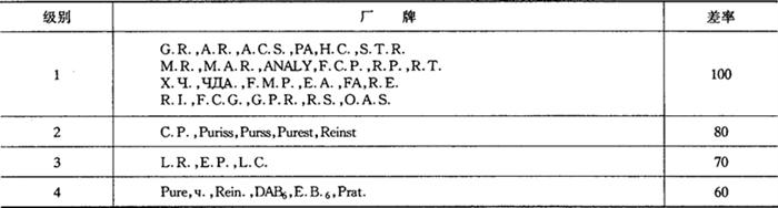 1972年上海化学试剂采购供应站又在他们编印的价目表中把进口试剂的厂牌和规格的价差率规定如表1-12: 表1-12 常见试剂厂牌规格价差率表*