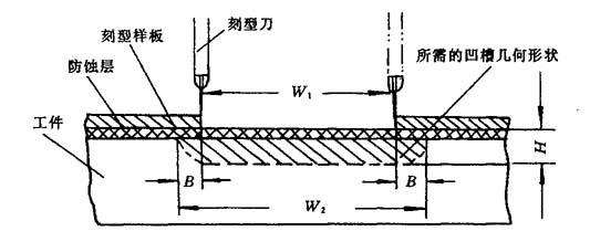 图9-23 化学铣削加工原理 9.4.1.2 工艺过程 (1)表面预处理 将工件表面清理干净并进行喷砂处理,工件表面应有一定粗糙度. (2)涂防蚀涂层 其目的是保护不要加工的部位.防蚀涂层必须有良好的耐酸、碱性能,并与工件表面结合良好.目前防蚀层多用聚氯丁橡胶为基的合成橡胶或异丁烯异戊间二烯(2-甲基丁二烯)共聚物作防蚀层. (3)刻蚀 依据样板的形状、尺寸,将待加工表面的防蚀层去掉.其方法是用手术刀沿样板轮廓切除耐蚀层.示意图见图9-24.一般将侧面腐蚀宽度B和腐蚀深度H之比定义为腐蚀系数K,即 K=2H/(W2-W1)=H/B 式中:K——腐蚀系数,根据腐蚀剂成分、浓度、工件材料等因素由实验确定; H——腐蚀深度(mm); B——侧面腐蚀宽度(mm); W1——刻型尺寸(mm);