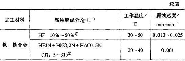 图9-24 刻型尺寸关系示意图 W2——最终腐蚀尺寸(mm). (4)活化 有些金属材料,如奥氏体不锈钢和镍基合金件,表面易生钝化薄膜,具抗蚀能力,故在化铣前要经活化处理,每次5~10min,活化液为7~12当量的盐酸液. (5)化铣 化学铣削的腐蚀剂随加工材料而有所不同,如表9-5所示.表中所列的腐蚀速率为平均值,实际上腐蚀速率的影响因素很多,如溶液浓度、温度、被加工材料的金相组织等. 化铣时,要注意大、小零件的装夹;注意溶液浓度的均匀、溶液的搅拌.取出零件后用清水冲洗. 表9-5 常用腐蚀液配方