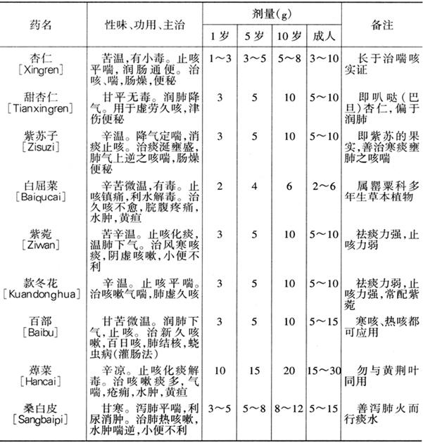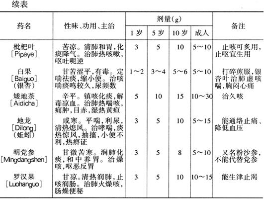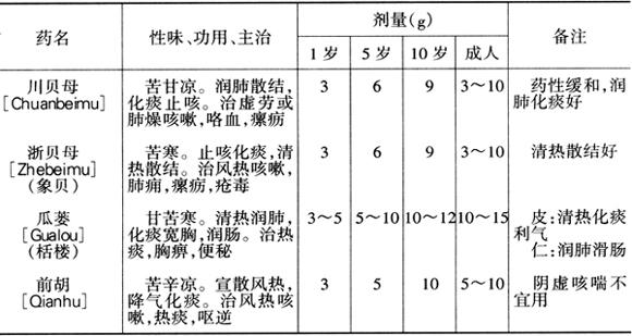 (二)清热化痰药 性味多甘寒或苦寒。甘寒清热润燥,苦寒降火。适用于热痰、燥痰咳喘以及由痰火所致的瘰疬、瘿瘤,由痰热所致的惊癎。应注意:①本类药易伤阳助湿,故脾胃虚寒、寒痰及湿痰均不宜用;②如火热偏盛者,可配清热泻火药;③如阴虚肺燥者,应配养阴润肺药。