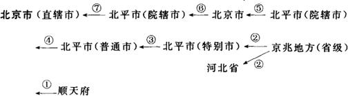 ①1912年称顺天府,府治北京;1914年10月由顺天府改设京兆地方(省级),辖区包括今河北省长城以南20余县,治所驻北京。②1928年6月撤销京兆地方,辖区北京改北平市(特别市);其余各县划归河北省。③1930年6月改为北平市(普通市)。④1930年11月改北平市为院辖市。⑤1937年10月12日,北平地方维持会擅自将北平市改为北京市。⑥1945年8月15日抗战胜利,北京市又改回北平市,为院辖市。⑦1949年9月27日中国人民政治协商会议通过决议,将北平市改为北京市(直辖市),作为中华人民共和国首都。