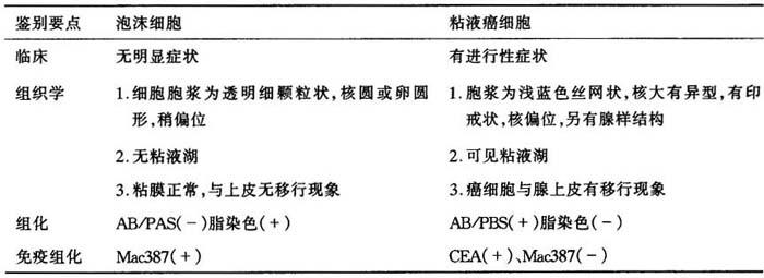 | 释义 | 十一、胃、肠道粘膜泡沫细胞浸润与低分化粘液细胞癌的鉴别 有时胃、肠道粘膜固有层泡沫细胞弥漫性浸润,易与低分化粘液细胞癌相混淆,尤其在冰冻切片诊断时要注意鉴别(表3-12)。 表3-12 泡沫细胞与粘液癌细胞的鉴别
