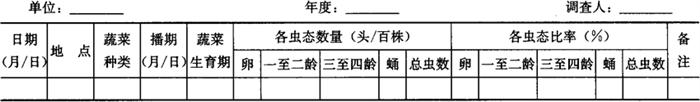 1.3 田间虫量调查 1.3.1 调查时间 十字花科蔬菜生长季节,每5天调查1次。 1.3.2 调查方法 选择当地有代表性的主要十字花科蔬菜不同类型田(不同蔬菜种类或不同播期)各1块,定点调查。采取对角线5点取样法,每块田固定5点,每点成株菜定5株,幼株菜定10株,记录卵、一至二龄幼虫、三至四龄幼虫、蛹的数量,折算各虫态百株虫量及其百分率。记入表6-63。 表6-63 小菜蛾虫口密度和发育进度调查表