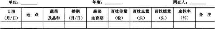 1.4.2 蔬菜生长期发生量普查 1.4.2.1 调查时间 十字花科蔬菜生长季节,小菜蛾成虫高峰期后2~5天,每10天普查1次。 1.4.2.2 调查方法 选择5个以上有代表性种植区域,每区调查2块田,采取对角线5点取样法,每田调查5点,每点5株。调查卵、幼虫、蛹、虫株率,换算百株卵、幼虫及蛹量。填入表6-65。 表6-65 大田普查小菜蛾虫量及为害情况调查表