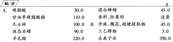 制法 分别将A、B中全部组分混合,得A组分和B组分,将A组分加热到80℃,开动搅拌,缓缓将B组分加至A组分中,全部加完后,再搅拌10mjn左右即可冷却,待冷至室温,即得成品。 这种雪花膏对皮肤具有明显的润泽效果,并可使皮肤细嫩。 |