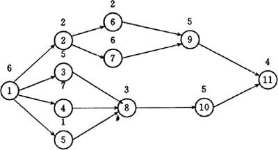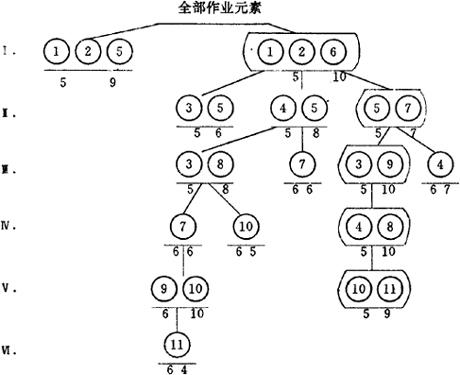 图4.6.2-2 注:图中圆圈表示作业元素;圆圈内数字为作业元素编号;圆圈上面的数字为该作业元素的单件作业时间;箭头代表作业元素之间的先后顺序关系。 第一,划分第Ⅰ工序。列举Ⅰ工序的各种可能方案及其作业时间,并计算各方案的工序数下限: a:①②⑤;作业时间=9;下限=1+〔(46-10)/10〕=5 b:①②⑥;作业时间=10;下限=1+〔(46-9)/10〕=5 当下限相同时,取作业时间大的,本例取①②⑥这一方案。 第二,划分第Ⅱ工序。据上,列举第Ⅱ工序的可能方案,计算其作业时间及工序下限数: a:③⑤;作业时间=6;下限=2+〔(36-6)/10〕=5 b:④⑤;作业时间=8;下限=2+〔(36-8)/10〕=5 c:⑤⑦;作业时间=7;下限=2+〔(36-7)/10〕=5 各方案下限相同,取④⑤这一组作业时间最大的。 第三,划分第Ⅲ工序。 a:③⑧;作业时间=8;下限=3+〔(28-8)/10〕=5 b:⑦;作业时间=7;下限=3+〔(28-7)/10〕=6 当下限不等时,取下限小的方案,故取③⑧这一方案。 第四,划分第Ⅳ工序。 a:⑦;作业时间=6;下限=4+〔(20-6)/10〕=6 b:⑩;作业时间=5;下限=4+〔(20-5)/10〕=6 取⑦这一方案。 第五,划分第Ⅴ工序。 a:⑨⑩;作业时间=10;下限=5+〔(14-10)/10〕=6 只有一个方案,故选此方案。 第六,划分第Ⅵ工序。只剩作业元素⑾,列为第Ⅵ工序,作业时间为4。 第七,对下限比“6”小的、尚未试验过的方案进行回溯寻找验证,比较有无更佳分配方案。此例中在第Ⅱ工序中存在着两个方案,选取作业时间长的方案⑤⑦。 第八,按⑤⑦这一方案,划分后续的第Ⅲ工序。 a:③⑨;作业时间=10;下限=3十〔(29-10)/10〕=5 b:④;作业时间=7;下限=3+〔(29-7)/10〕=6 选③⑨这一方案。 第九,划分第Ⅳ工序。 ③⑧;作业时间=10;下限=4+〔(19-10)/10〕=5 因只此一方案,故选取之。 第十,划分第Ⅴ工序。得⑩⑾。因为不存在工序数下限比“5”更少的方案,所以不再作回溯试验。 作业元素分配程序及结果如4.6.2-3所示。图中精线框为最后确定的工序划分方案,各节点左下方数字为工序数下限,右下方数字为该作业元素组合的作业时间。