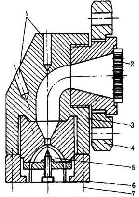 图11-6 直角式单丝机头结构示意图 1-温度计插入孔 2-过滤板 3-模体 4-连接法兰 5-分流器 6-喷丝板 7-锁紧螺丝 机头流道直径应逐渐缩小,产生压力将塑料压实,一般取D/d=(2~4)/1。分流器扩张角一般为30°~80°,分流器处流道的截面积应大于喷丝孔截面积之和。 主流道未设置了一个“瘦颈”,对物料形成了一定的阻力,然后,将物料均匀地输送到喷丝板。设置瘦颈的优点是:喷丝板各处物料压力均匀,流量稳定,减少机头内存料及物料分解的可能,也减少清理机头的废料。 3.喷丝板 喷丝板是机头的主要部件,其结构如图11-7所示。