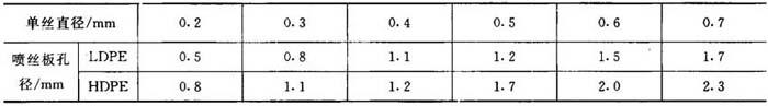 图11-7 喷丝板结构图 1-模体 2-引入导板 3-孔径包角 喷丝孔的直径主要根据单丝直径与拉伸比决定,拉伸比为6时的LDPE和拉伸比为8时的HDPE的单丝直径与喷丝孔直径的关系见表11-2。 表11-2 单丝直径与喷丝孔直径的关系
