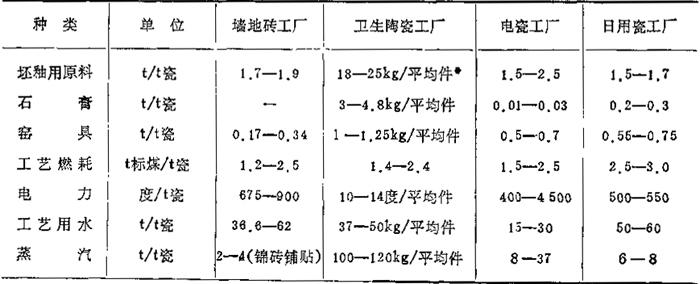 表中,原料消耗视产品成型方式、工厂规模,大厂取低限、小厂或电瓷套管取高限;石膏消耗(按石膏原矿核算)小厂取高限,购买熟石膏粉或大厂取低限;窑具消耗视窑型、产品及装烧方式,其承受冷热急变及高温荷重大者取高限;工艺燃耗,先将媒耗、油耗或燃气耗折算为标准煤耗,视窑型、产品种类、燃料种类、装窑方式的综合热利用情况,优者取低限;电力消耗视工厂机械化程度高低与工厂规模大小,相应取值由高限逐步递减;工艺用水视生产规模大厂取低限、小厂取高限;蒸汽消耗一般小厂取低限、大厂取高限。