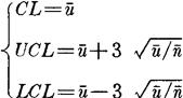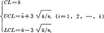 | 释义 | 单位缺陷数(u)控制图 简称u-图。它是用于判断或监控生产过程的单位产品缺陷数是否处于或保持标准所要求的水平。u-图主要用于质量指标为计点(如疵点、缺陷点、某细菌个数等)的场合。其作法是:抽取k个(k≥25)样本,要使每个样本平均至少有一个缺陷点。设第i个样本容量为ni,内含缺陷数为ci,则单位缺陷数及其均值的标准计算公式是: