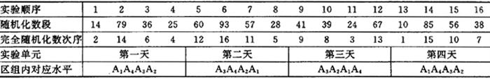 | 释义 | 单因素试验设计 在科学研究、工程实施或者生产过程中,只要求观察某一因素的水平变动对实验结果的影响,称这种实验方案的安排及其数据处理为单因素实验设计。 在进行单因素实验的过程中,要求参加实验的其他因素及其水平保持不变,只存在环境条件的随机波动。 1.实验顺序的随机化 对于观察的因素A,有p个水平数,A1,A2,……Ap,在随机置换表上闭着眼睛用铅笔任意指定一点,如56行中第4列上的3,接下去的数据是38640579……,如果水平数n<10,那么随机数的顺序就是对应水平数的顺序,于是实验顺序为 实验顺序 1 2 3 4 5 6 7 随机数顺序 3 8 6 4 0 5 7 水平安排 A2 A7 A5 A3 A1 A4 A6 如果水平数n≥10,可以用两个或两个以上随机化数字作为一组,以每组数值的大小依次对应各个水平,按照数组的位置作为对应水平的实验顺序。 2.区组内的随机化 在因素A有P个水平的情况下,每个条件重复七次,总共的实验次数为n=tp。如果在一个单元时间内不能做完,需要安排若干个实验区组。为了不导致人为的水平差异,应将同一水平的重复实验安排到不同的区组中,区组内各水平的实验顺序按随机化原则安排,即形成随机完全区组实验。 例如,因素A有4个水平,每个水平下重复4次实验,分4天进行,总实验次数n=16。每天一个区组,4个水平的实验顺序各不相同。例如,在随机置换表上挑中了第5行的147936256093572841392467108556382……以两位数一组表示水平数,4个区组的实验顺序如表4.3.2-1所示。 表4.3.2-1 随机化实验顺序