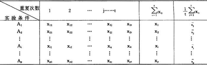 3.实验数据的采集表 每一次实验之后,必须观测指标数据,以xij表示。按水平顺序记录于表4.3.2-2内,然后填入各水平重复实验后的指标均值。 表4.3.2-2 单因素的实验数据统计表