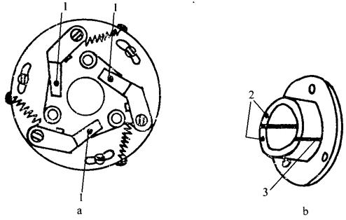 图2-28 离心开关结构示意图 a.动触头部分 b.静触头部分 1.指形铜触片 2.铜片 3.绝缘 离心开关的静触头部分是两个互相绝缘的半铜环,副绕组的一端和电源的一端分别焊接在两个半铜环上。静触头部分安装在电动机端盖内部。动触头部分则装在转轴上与静触头部分相对应的一端。动触头部分的铜条借弹簧力压紧在半铜环上,不论动触头部分转至任何位置,总有一根铜条使两个半铜环接通,即副绕组回路接通电源。起动后,当电动机转速达到75%~80%的同步转速时,其离心力大于弹簧拉力,将三根铜条从静触头部分抬起,将副绕组回路切离电源。 (2)差动式起动继电器:是常闭触头串联在副绕组回路中,借弹簧力的作用使之闭合而接通副绕组回路。电动机起动时,起动电流通过继电器的电流线圈,产生电磁吸力而使常闭触头可靠闭合着。随着电动机转速升高,起动电流减小,继电器电流线圈产生的电磁吸力减弱,同时在继电器电压线圈电磁吸力的作用下,常闭触头打开,切断副绕组回路。 (3)电流式起动继电器:是常开触头串联在副绕组回路中,电流线圈与主绕组串联。电动机接通电源后,比额定电流大几倍的起动电流,通入继电器的电流线圈而产生足够的电磁吸力,使触头闭合,接通副绕组回路,电动机起动。随着转速升高,起动电流减少。当转速升高至同步转速的75%~80%时,继电器线圈中通过的电流减小到所产生的电磁吸力不足以维持触头的闭合,故触头打开,切断副绕组回路。 (4)电压式起动继电器:是继电器的电压线圈与副绕组并联,常闭触头将起动电容器和副绕组串联。当电动机起动后转速升高到70%左右的同步转速时,继电器电压线圈的电流增大到电磁吸力足以将触头打开,切断副绕组回路。 2.电容器 起动电容器只在起动瞬间工作,通电时间一般只是数秒钟,可采用体积小、容量大、价格低廉的电解电容器。 运转电容器在电动机运行时也通电工作,不能采用漏电较大、且有极性的电解电容器,而应采用油浸式电容器或金属化纸介质电容器。 从维修角度应该指出:电容电动机若出现起动转矩太小或无起动转矩的故障,应检查判断电容器是否发生了断路或短路。 (1)电容器的电容量一般都标在其外壳上。对电容器的电容量可用电容电桥测定,也可施加交流电压,通电流,测得电压和电流值后,用下式算出:
