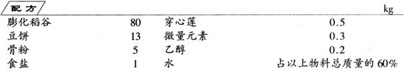 (2)在膨化稻壳中,加入豆饼、骨粉、食盐、穿心莲、微量元素等辅料。在不断搅拌的情况下,加入以上物料总质量60%的清水搅匀。