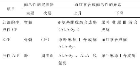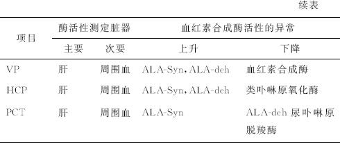 | 释义 | 卟啉病 一、概述 血卟啉病(血紫质病)系由先天性卟啉代谢紊乱,卟啉前体或卟啉在体内聚积所致。常有遗传因素。临床表现有腹痛、神经精神症状、光感性皮肤损害等。卟啉主要在红骨髓和肝内合成,根据卟啉代谢紊乱出现的部位,分为红细胞生成性卟啉病和肝性血卟啉病二类。前者较少见,属儿科学范围。 肝性血卟啉的临床表现可分为:①急性间歇型 以腹痛、神经精神症状为主要表现,临床较多见;②迟发性皮肤型 卟啉的共同特性是能吸收400mm范围的光波,卟啉及其衍生物吸收光波后被激活而放出荧光,破坏皮肤表皮细胞溶酶体,因而产生皮肤病变、红斑、水疱、湿疹、瘢痕形成和色素沉着;③混合型 兼有前二型症状;④遗传性粪卟啉型 有家族史,临床特点是粪便中排出粪卟啉Ⅲ增多而无症状,但在巴比妥、甲丙氨酯等药物诱发下可出现急性间歇型症状,个别可有光感性皮肤损害的表现。 二、发病机制 本病的病因尚未完全明了。根据卟啉的病理生理,当血红素生成障碍,失去负反馈作用,就失去对α-氨基酸酮戊酸合成酶的抑制作用。阻遇物或操纵基因发生突变,失去正常的抑制,使α-氨基酸酮戊酸合成酶的活性异常地增加,酶的缺陷,如尿卟啉原Ⅲ辅合成酶缺乏,卟胆原不能转变为尿卟啉原而只形成尿卟啉原Ⅰ,以致产生多量的异构体,或尿卟啉原Ⅰ合成酶缺乏,卟胆原不能转变为尿卟啉原等,均可产生多量的卟啉和卟啉前体,而导致本病。 三、分类 根据各病型的酶异常部位与主要的临床症状分类如下(日本矢野雄三,1982): 1.红细胞生成性血卟啉病 (1)先天性血卟啉病(CP)。 (2)红细胞生成性原卟啉病(EPP)。 2.肝性血卟啉病 (1)迟发性皮肤血卟啉病(PCT):遗传性PCT;症状性PCT。 (2)急性间歇性血卟啉病(AlP)。 (3)变异性血卟啉病(VP)。 (4)遗传性粪卟啉病(HCP)。 四、临床表现 各型血卟啉病的酶异常见表27-1。 表27-1 各型血卟啉病的酶异常(日本,蒲田郡平,1980)