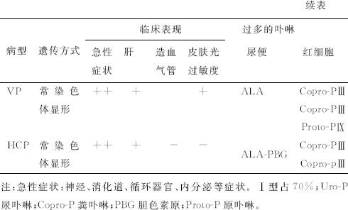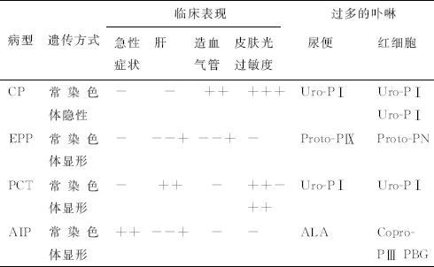 五、诊断 本病诊断依据为临床症群(皮肤症群、腹部症群及神经精神症群),实验室检查大小便中出现大量尿卟啉及粪卟啉,间歇性急性型还可有肝功能损害,卟胆原测验阳性。 血卟啉病各型间的区别主要根据临床表现与卟啉排泄形式来鉴别,见表27-2。 表27-2 血卟啉病各型间的区别