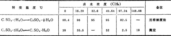 硫酸钙在卤水中的溶解度比在淡水中大得多,同一温度常大一倍以上。当卤水浓度低于相对密度( 硫酸钙的结晶体,有二水盐、半水盐、无水盐之分,这三种晶体在不同温度下常常变化,因脱水、得水而产生收缩和膨胀现象。这三种晶体的转化温度在卤水中比在淡水中低。如表2-5-20所示。二水硫酸钙加热到150℃时,才能转化为半个结晶水的水合物。 表2-5-20 硫酸钙晶体的转变温度