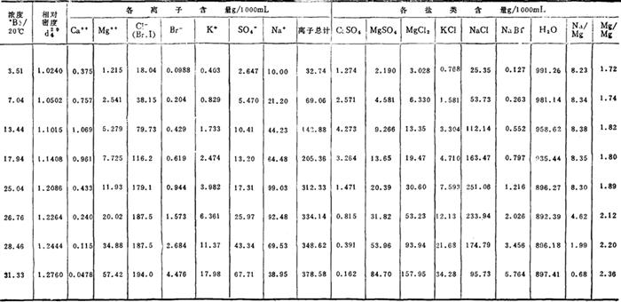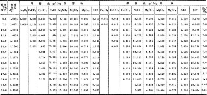 注:上表试验,蒸发温度40℃,测定浓度温度27℃。 表2-1-9 天津轻工业学院盐化工程系孙之南、郭绍珍的试验(渤海湾海水)