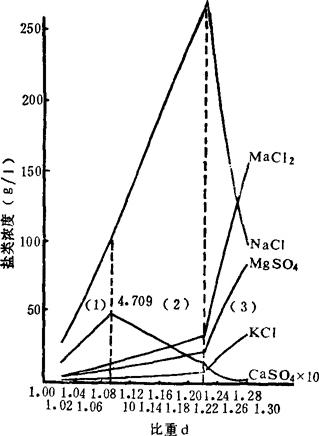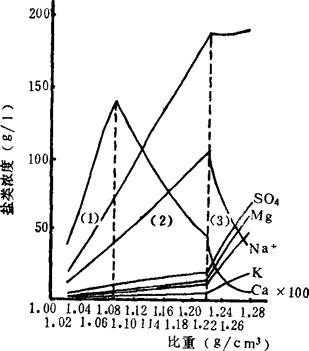 图2-1-2 海水浓缩过程中盐类浓度与比重关系曲线 图2-1-2盐类曲线同样又分三个区,其中硫酸钙浓度曲线在(1)区呈上升趋势,(2)区呈下降趋势;氯化钠浓度曲线由(2)区转入(3)区时,发生同样变化。从而表明:由(1)区到(2)区,即 卤水饱和点和结晶析出点与卤水组成的关系,在水盐体系内,饱和点是指溶解和结晶过程的平衡点,对该盐类来说在卤水中的成分是不变的,其饱和点可以确定。而析出点是指该盐类在卤水中饱和后,继续蒸发,具有一定过饱和推动力后开始结晶的那个点。这个点的该盐成分高于饱和点。按相平衡而论,析出点是相变点,饱和点是平衡点,相数不发生变化。 |