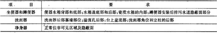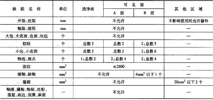 注:其他在窑炉内支撑烧成时非可见面区域也可以无釉覆盖。 (2)外观缺陷最大允许范围 对产品的洗净面、可见面、其他区域(安装面和隐蔽面)进行划分。外观缺陷最大允许范围应符合表6-72的规定。 表6-72 卫生陶瓷外观缺陷最大允许范围