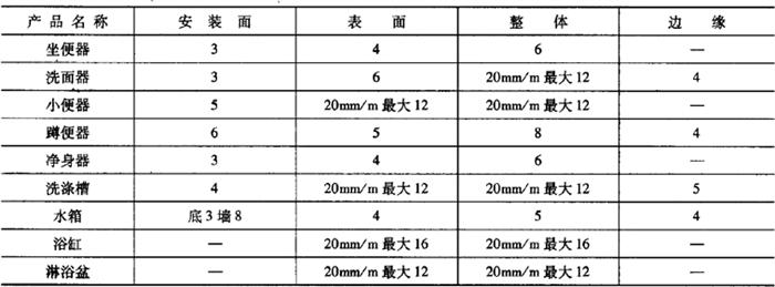 注:1.数字前无文字或符号时,表示一个标准面允许的缺陷数。 2.其他面,除表中注明外,允许有不影响使用的缺陷。 3.0.5mm以下的不密集棕眼可不计。 4.最大允许变形(表6-73) 表6-73 卫生陶瓷产品的最大允许变形量mm