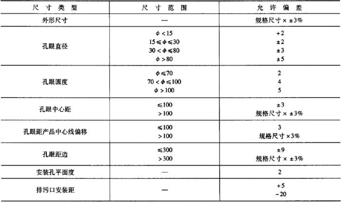 注:形状为圆形或艺术造型的产品,边缘变形不作要求。 5.尺寸 (1)尺寸允许偏差(表6-74) 表6-74 卫生陶瓷的尺寸允许偏差mm