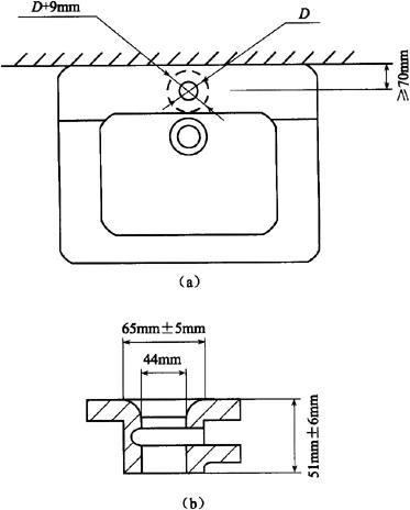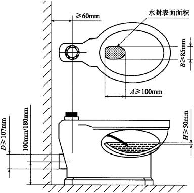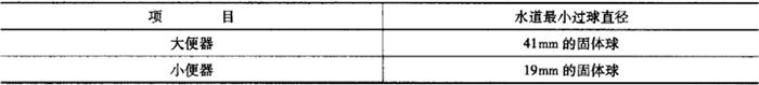 3)水封深度。所有带整体存水弯卫生陶瓷的水封深度不得小于50mm。 4)坐便器水封表面面积。安装在水平面的坐便器水封表面面积不得小于100mm×85mm。 5)冲洗阀式坐便器和小便器进水口距墙。用冲洗阀的坐便器进水口中心至完成墙的距离、用冲洗阀的小便器进水口中心至完成墙的距离应不小于60mm。 6)大便器和小便器水道最小过球直径见表6-77。 表6-77 大便器和小便器水道最小过球直径
