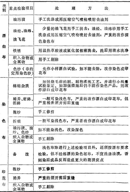 注:色地印花布不需涤增白。 6.涤粘、涤腈中长纤维混纺布 准备→烧毛→退浆或洗涤→烘干 涤粘、涤腈中长纤维混纺布一般加工染色产品;对采用卷染法染色的色布,烧毛宜放在染色后进行,以免产生散布性色点疵布。 (二)工序、名词解释 1.准备 准备是指原布在烧毛、退浆前的第一道工序,包括原布检验、分批、分箱(卷)、打印、缝接等。 原布检验的内容包括物理指标和外观疵点。物理指标有长度、幅宽、重量、密度和强力等,外观疵点的检验视品种而定。重点检验项目及处理办法见表18-198。 表18-198 重点检验项目及处理方法