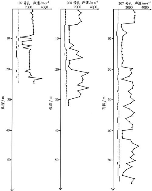 | 释义 | 危岩锚固钻孔内裂缝及裂缝密集带声波检测 长江三峡链子崖50000方危岩体防治工程,采用锚索加固处理,锚固孔深30~40m不等,最深达64.2m。危岩体主要以栖霞灰岩为主,裂隙发育且为张性,局部成破碎软弱带。锚固施工需掌握上述裂缝、软弱结构面在锚固孔中的位置,分布及几何尺寸。地质矿产部水文地质工程地质技术方法研究所承担此项特种检测任务,研制一发一收干耦合换能器,在不能存留井液的水平干孔中,完成了共2670m的测试,指导了施工。图1-6其中三个钻孔的测试结果,其中视声速低于1000m/s(图中粗实线部分)的低速孔段均为裂隙及裂隙密集带(展建设、曹修定实测,1996)。