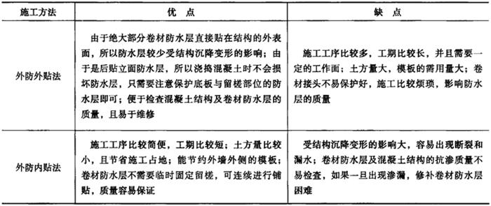 | 释义 | 卷材防水结构 卷材防水层是由防水卷材和沥青胶结材料胶合而成的一种多层防水层。卷材防水层是一种柔性防水层,适用于有振动的结构,如果出现微小变形不致裂缝;但由于其耐久性差、施工复杂,应用范围受到一定限制。 防水卷材尽量采用沥青矿棉纸油毡、沥青玻璃布油毡、沥青石棉纸油毡及无胎油毡等,应采用石油沥青胶结材料,在铺贴前应满涂冷底子油。 地下防水工程如果把卷材防水层设在建筑结构的外侧,称为外防水;把卷材防水层设在建筑结构的内侧,称为内防水。在一般情况下,应优先选择外防水。外防水的防水层在迎水面,受压力水的作用紧压在结构上,防水效果较好。内防水的卷材防水层在结构的背面,受压力水的作用容易脱开,对防水不利。 外防水有两种施工方法,即“外防外贴法”和“外防内贴法”,两种施工方法的优缺点,如表8-27所示。 表8-27 外防水两种施工方法的比较