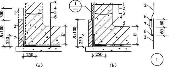 图8-13 卷材外防外贴法 (a)甩槎做法;(b)接槎做法(a)中:1-临时保护墙;2-永久保护墙;3-细石混凝土保护层;4-卷材防水层;5-水泥砂浆找平层;6-混凝土垫层;7-卷材加强层(b)中:1-结构墙体;2-卷材防水层;3-卷材保护层;4-卷材加强层;5-结构底板;6-密封材料;7-盖缝条 外防外贴法的施工程序如下: (1)首先浇筑需要防水结构的底层混凝土垫层,这是防水层的基础,必须认真施工、质量合格。 (2)在混凝土垫层上砌筑永久性保护墙,在保护墙下铺一层干油毡。墙的高度不小于需防水结构底板厚度再加100mm。 (3)在永久性保护墙之上,用石灰砂浆接砌一段保护墙,墙高一般为300mm。 (4)在永久性保护墙上抹1∶3水泥砂浆找平层,在临时保护墙上抹石灰砂浆找平层,并刷一层石灰浆。如果用模板代替临时性保护墙,应在其上涂刷隔离剂。 (5)待砂浆找平层基本干燥后,在大面积铺贴卷材之前,应先在转角处粘贴一层卷材附加层,然后进行大面积铺贴,先铺平面,后铺立面。在垫层和永久保护墙上应将卷材防水层空铺,而在临时保护墙(或模板)上应将卷材防水层临时贴附,并分层临时固定其顶端。 (6)当不设置保护墙时,从底面折向立面的卷材的接槎部位,应采取可靠的保护措施。 (7)卷材固定完毕后,可浇筑需防水结构的混凝土底板和墙体,并在需防水结构外墙外表面上抹找平层。 (8)主体结构完成后,将所有各层卷材揭开,并将其表面清理干净,如卷材有局部损伤,应及时进行修补,然后铺贴立面卷材。卷材的搭接长度,高聚物改性沥青卷材为150mm,合成高分子卷材为100mm。当使用两层卷材时,卷材应错槎接缝,上层卷材应盖过下层卷材。 (9)待卷材防水层施工完毕,并经检查验收合格后,即应及时做好卷材防水层的保护结构。保护结构的几种做法: 1)砌筑永久保护墙,并每隔5~6m及在转角处断开,断开的缝中填以卷材条或沥青麻丝;保护墙与卷材防水层之间的空隙,应当随砌随用砌筑砂浆填实,保护墙完工后方可回填土。注意在砌筑保护墙的过程中切勿损坏防水层。 2)抹水泥砂浆。在涂抹卷材防水层最后一道沥青胶结材料时,趁热撒上干净的热砂式散麻丝,冷却后随即抹上一层厚度为10~20mm的1∶3水泥砂浆。水泥砂浆经养护达到强度后,即可回填土。 3)贴塑料板。在卷材防水层外侧直接用氯丁系胶粘剂粘贴固定5~6mm厚的聚乙烯泡沫塑料板,完工后即可回填土,也可用聚醋酸乙烯乳液粘贴40mm厚的聚苯泡沫塑料板代替。 (二)外防内贴法施工 外防内贴法是浇筑混凝土垫层后,在垫层上将永久保护墙全部砌好,将卷材防水层铺贴在垫层和永久保护墙上,其构造如图8-14所示。