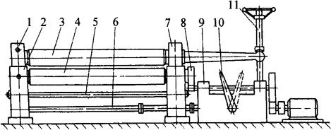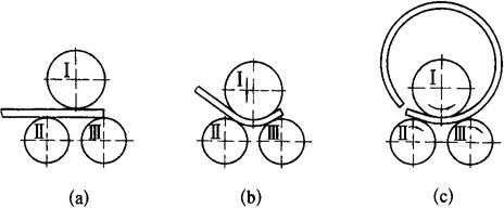 图5-17 对称式三轴卷板机 1-活动轴承;2-支座;3-上轴辊;4-下轴辊;5-拉杆;6-传动拉杆;7-固定轴承;8-齿轮;9-变速箱;10-操纵柄;11-卸料装置 图5-18展示了对称式三轴卷板机的工作原理。主动轴辊Ⅱ、Ⅲ通过电动机和减速机构带动,以相同的速度向同一方向旋转(也可同时反转)。由于轴辊和板材之间的摩擦作用,带动板料向前运动和上轴辊的转动。适当向下调整上轴辊的位置,即可对板料进行不同曲率的滚弯。