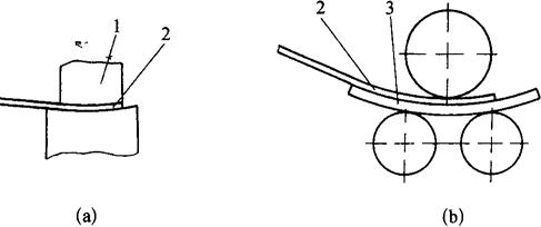 图5-18 对称式三轴卷板机的工作原理 (a)摆正钢板;(b)向下调上轴辊,压弯钢板;(c)轴辊转动,卷制圆筒 如果一次滚压以后,工件不能达到所要求的曲率,可适当降低上轴辊,再反向滚压一次,这样反复多次,直至滚压成所需形状。 从图5-18可以看出,对称式三轴卷板机的三根轴辊呈等腰三角形排列,所以在滚弯过程中,工件的两端都必然会留下直线段。直线段的长度约等于两个下轴辊中心距的一半,这部分直线段是轴辊无法滚压到的地方,这也正是对称式三轴卷板机的最大缺点。尽管对称式三轴卷板机存在着上述缺点,但由于它结构简单、操作方便、造价低,还是获得了广泛的应用。 至于消除直线段的问题,可以结合具体情况,采用不同的方法加以解决。 (1)压头预弯 俗称戴头,如图5-19(a)所示。这种方法是利用模具在压力机上预弯钢板的两端,使其先达到所需的曲率。