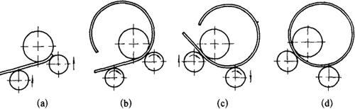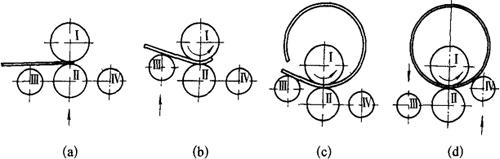图5-20 不对称式三轴卷板机工作原理图 (a)调整下轴辊,对板材起始端进行压弯;(b)滚压;(c)改变下轴辊的排列,继续滚压;(d)滚压结束 三轴不对称卷板机的轴辊排列方法是为了消除卷制工件上的直线段而设计的。这种卷板机的特点是两个下轴辊可分别作垂直方向调整。可以将任一个下轴辊调至和上轴辊中心距很小的位置,另一个轴辊向上调至合适的位置,即可对钢板的起始端进行压弯并滚弯。在滚完一半以后,改变两个下轴辊的排列,继续滚压,即可将工件末端的直线段消除。也可将工件调头,末端变起端来进行滚压,同样达到消除直线段的目的。 能消除直线段,是不对称三轴卷板机的突出优点。但由于工作时,这种卷板机的轴辊是不对称排列的,因此,两个下轴辊受力不均,靠近上轴辊的比侧辊受力大,工作中容易产生弯曲变形,而影响工件的质量。另外,和三轴对称式卷板机比较,其结构复杂,操作也比较困难。所以,这种卷板机目前很少采用。 3.四轴卷板机 四轴卷板机的工作原理,如图5-21所示。