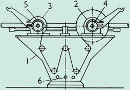 普通型卷染机示意图1.染槽2、3.卷布轴4、5.制动装置6.蒸汽管 |