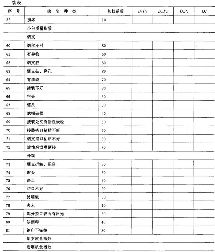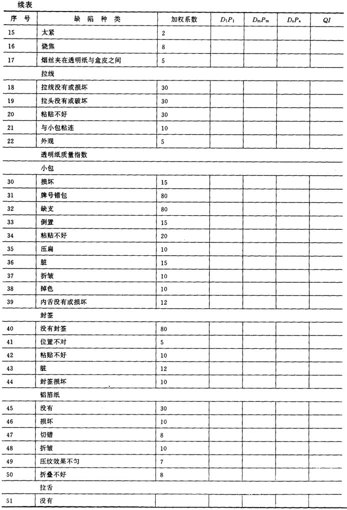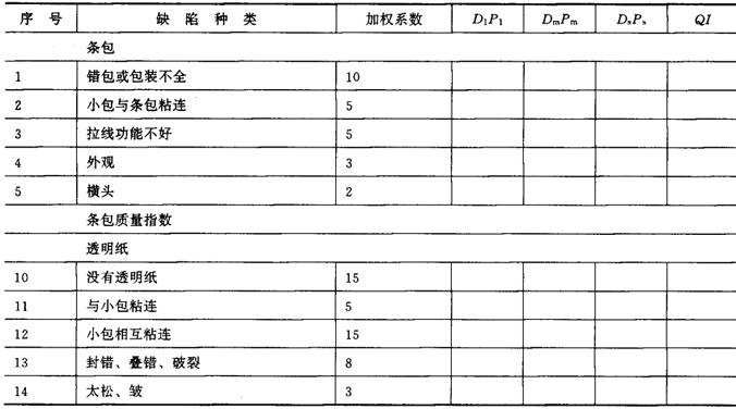缺陷的严重程度(D)分为轻、中、重三类。轻度缺陷的严重程度系数(D1)为1/3,中等缺陷的严重程度系数(Dm)为2/3,严重缺陷的严重程度系数(Ds)为1。 缺陷频率(P)按缺陷在检验中出现的缺陷百分率进行计算。对应轻、中、重三类缺陷的百分率以P1、Pm、Ps表示。 2.质量指数的计算 QI=∑(N×D×P) 式中 QI——卷烟质量指数; N——缺陷加权系数; D——严重程度系数; P——缺陷频率。 3.检验程序 用于常规评价目的的样品数量是每个牌号4~8条。用于市场评价目的的样品数量是每个牌号20条。 样品由4个检验员检验(无论何种情况,检验工作不能由一人完成)。每个检验员都有典型缺陷及严重程度的样本书,检验员对照样本书检出缺陷,并对缺陷进行严重程度评价,计算缺陷百分率。然后计算每个缺陷、每个项目(条包、透明纸、小包、烟支)的质量指数,最后计算每个牌号的质量指数。 4.计算示例 检验时发现卷烟有空头缺陷,观察的百分率如下:P1是5%,Pm是1%,Ps是0.5%。 空头缺陷的加权系数是60。计算如下: 60×1/3×5%=1.0 60×2/3×1%=0.4 60×1×0.5%=0.3 空头缺陷的质量指数=1.7 5.质量评价表 质量评价表见表3-4-5。表中的序号按项目(条包、透明纸、小包、烟支)编号,既可增加新的缺陷,也便于利用计算机进行处理。 表3-4-5 质量评价表